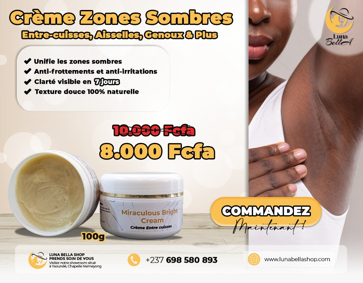La Crème Zones Sombres cible efficacement les entre-cuisses, aisselles, genoux et autres zones à pigmentation irrégulière. Sa formule 100 % naturelle unifie le teint tout en réduisant les frottements et irritations. Grâce à sa texture douce, elle apporte confort et protection, avec des résultats visibles dès 7 jours. Conditionnée en pot de 100 g, elle s’intègre parfaitement à votre routine pour une peau plus claire et apaisée.